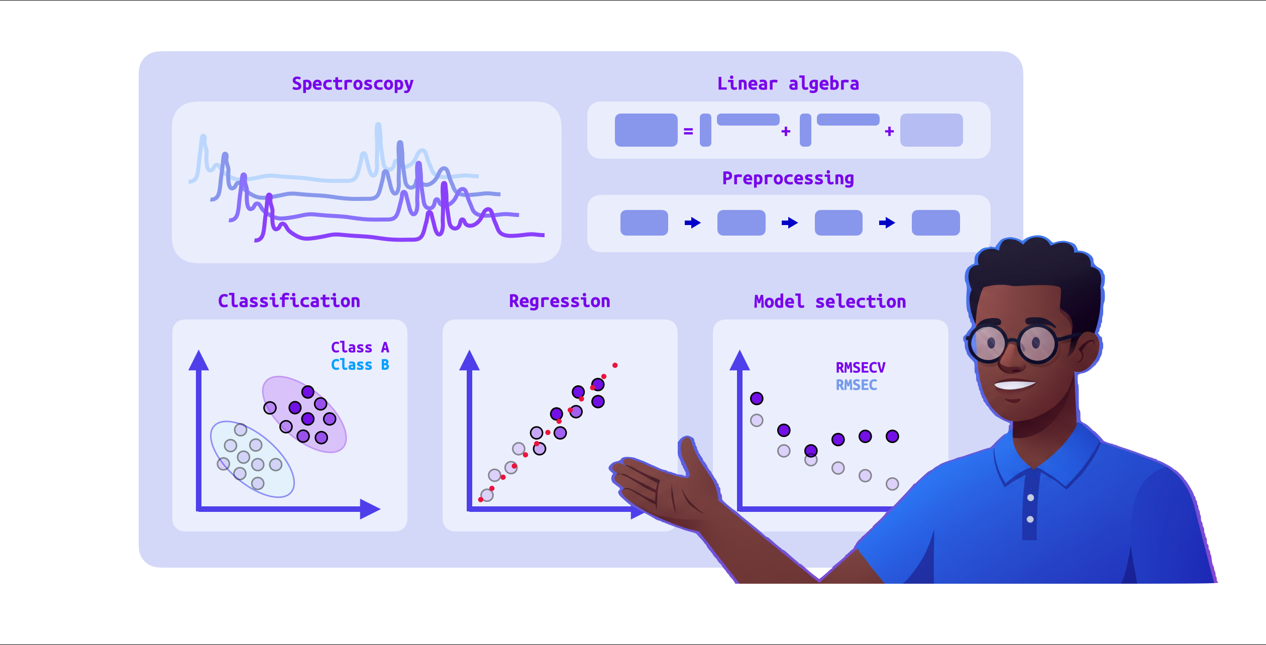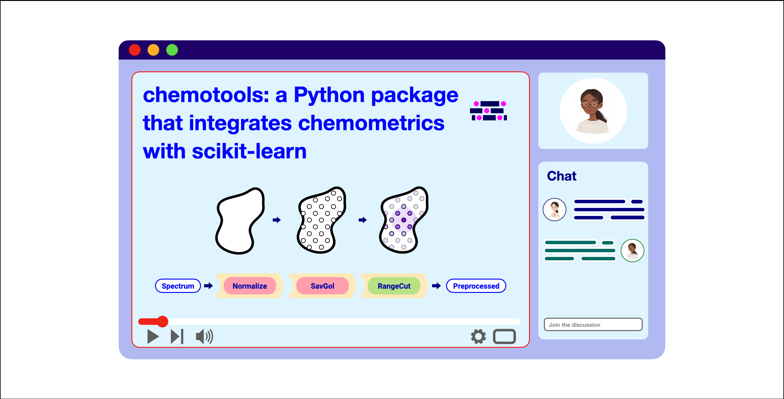 Desarrollado tras años de aplicar espectroscopía en diversas industrias, su misión es empoderar a científicos e ingenieros con las herramientas necesarias para construir modelos quimiométricos listos para producción. chemotools proporciona un entorno intuitivo y flexible que agiliza el desarrollo y despliegue de modelos, facilitando la estandarización de flujos de trabajo y el escalado de soluciones quimiométricas.